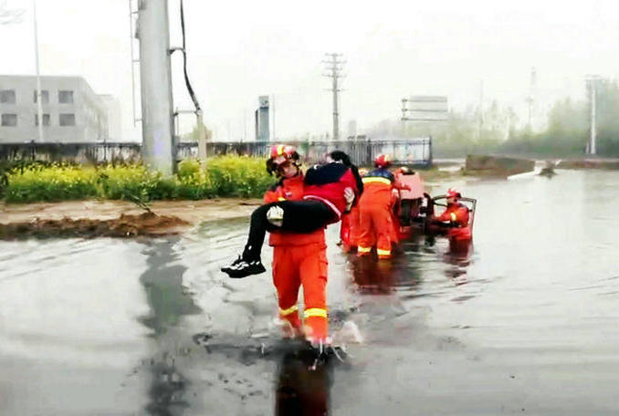 救援人員徒步涉水靠近三輪車(chē),先把被困人員解救出來(lái),然后冒雨把三輪車(chē)從水坑中緩慢推出。