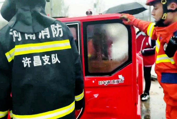 河南禹州:三輪車(chē)誤入水坑致兩人被困 消防隊(duì)員迅速趕赴現(xiàn)場(chǎng)救援