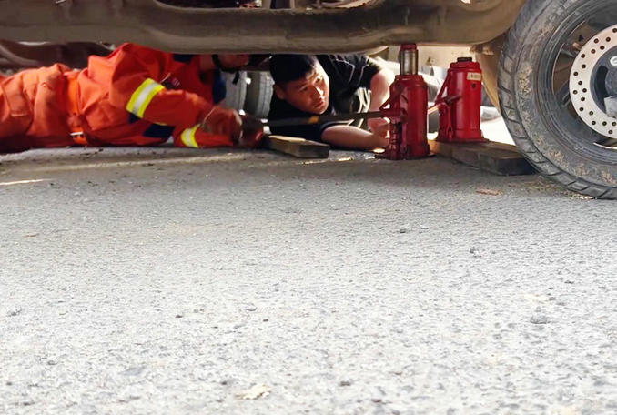 由于車底空間狹小,給救援工作帶來諸多不便,F(xiàn)場指揮員立即安排一名經(jīng)驗(yàn)豐富的消防員,攜帶千斤頂?shù)裙ぞ咩@入車底,利用千斤頂將貨車的車頭一點(diǎn)點(diǎn)抬起。