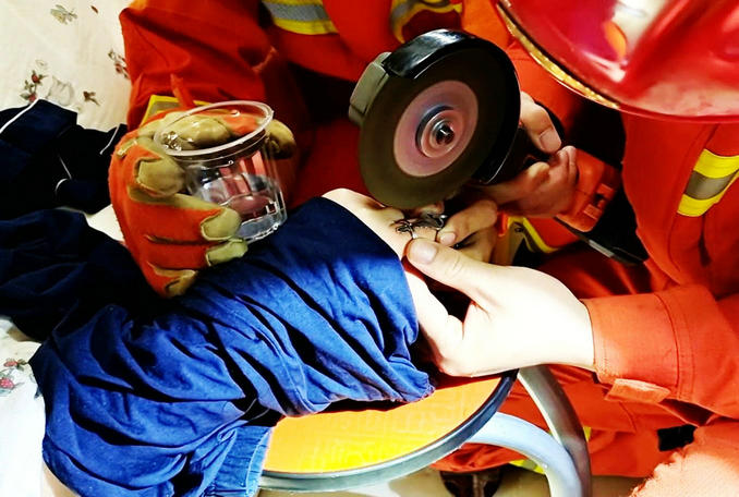 到達現(xiàn)場后,消防救援人員發(fā)現(xiàn)該女子右手的無名指被一枚戒指卡住,手指末梢發(fā)生充血腫脹。