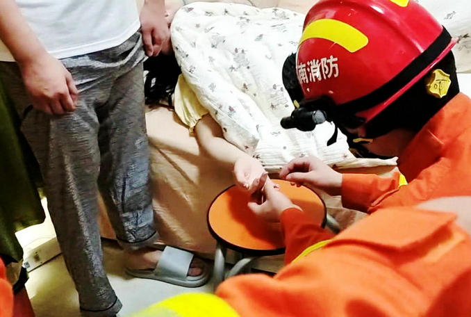 河南襄城:一名女子戒指卡手導致紅腫 消防隊員迅速趕赴破拆救援