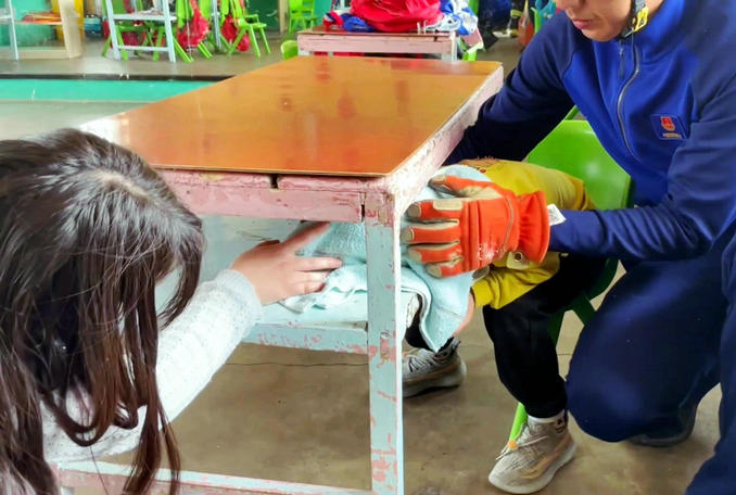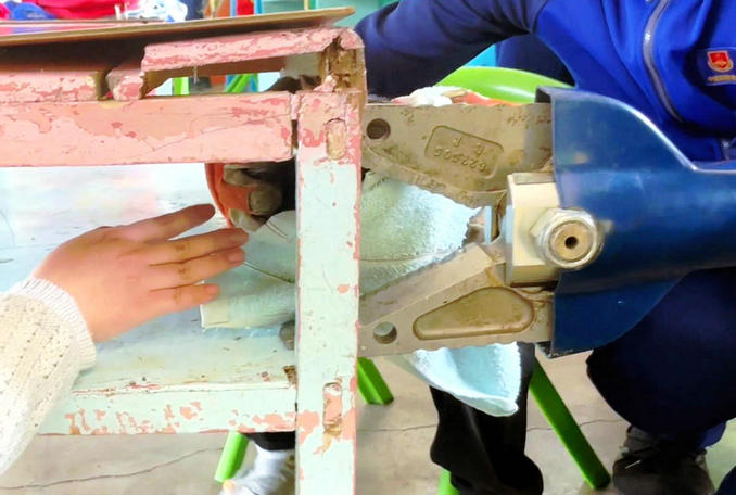 到達現(xiàn)場后,救援人員詢問得知:一名小朋友因突發(fā)奇想,將腦袋伸進課桌的桌斗,不慎頭部被卡無法拔出。