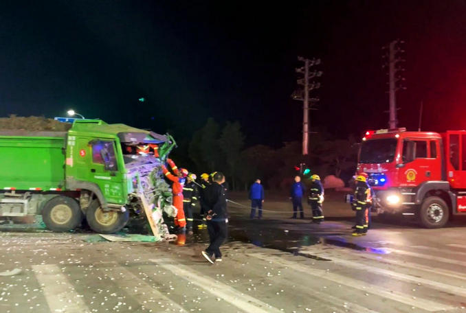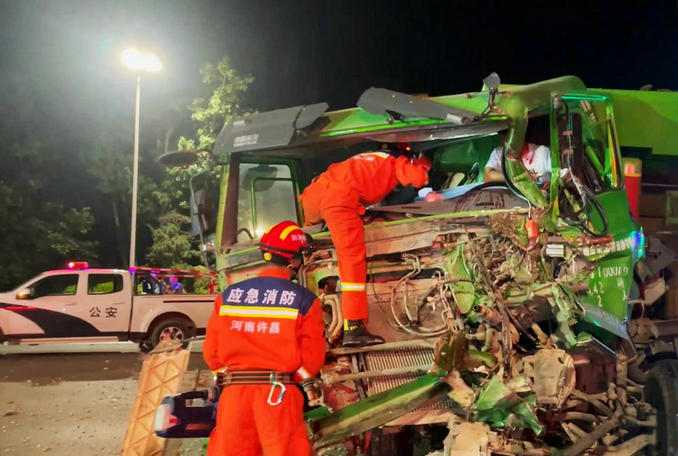 河南許昌:深夜渣土車意外追尾半掛車 消防隊(duì)員立即趕赴破拆救援