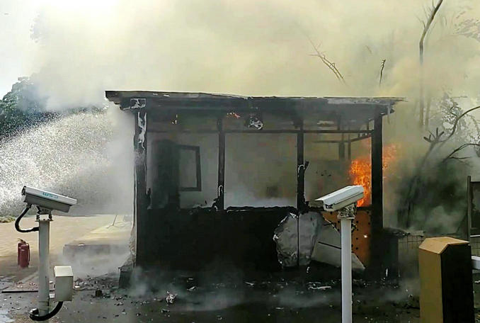 到達現(xiàn)場后,救援人員發(fā)現(xiàn)收費崗?fù)ふ幱诿土胰紵A段,大量的火焰裹著濃煙不斷向外蔓延。