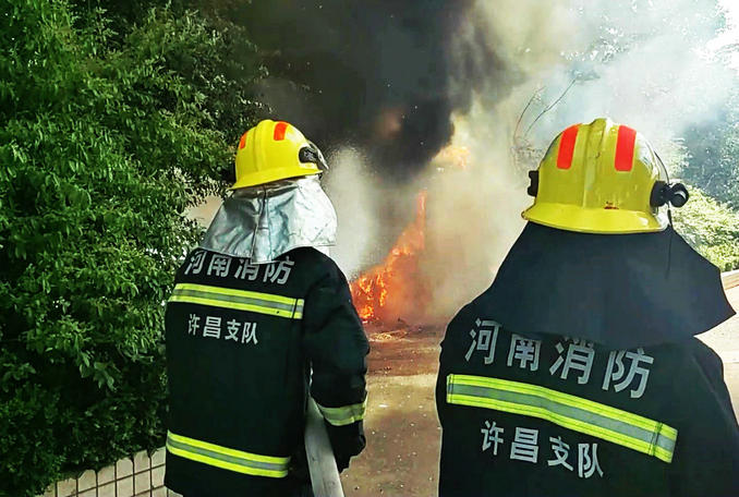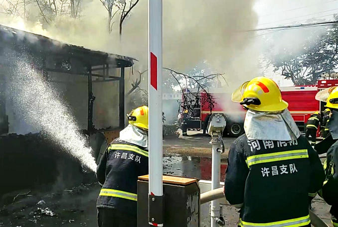 河南許昌:一停車場崗?fù)ぞ路老化失火 消防隊員迅速趕赴處置救援