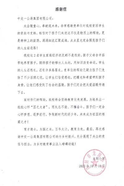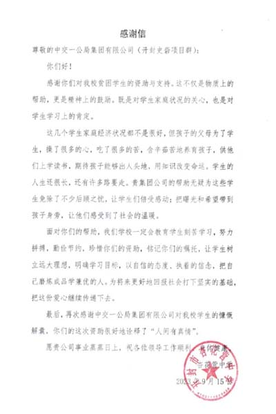 中交一公局七公司服務(wù)有溫度 學(xué)校送感謝信表謝意