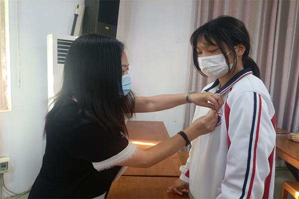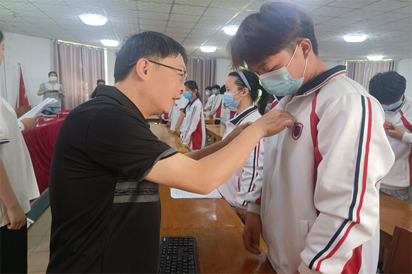 活動在莊嚴(yán)的國歌聲中拉開序幕。在宣讀了新團(tuán)員名單后,與會領(lǐng)導(dǎo)為新團(tuán)員們佩戴上閃耀的團(tuán)徽。全體團(tuán)員面向鮮艷的團(tuán)旗,高舉右拳莊嚴(yán)宣誓。