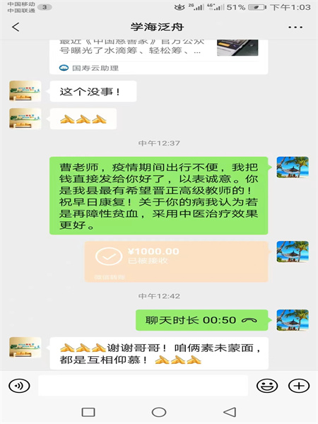 李宗峰,開封市祥符區(qū)中華職業(yè)教育社社員,開封電子科技學校正高級教師。驚聞祥符高中優(yōu)秀教師曹志剛,身患特重型再生障礙性貧血,骨髓移植費得50多萬元,前期治療已花醫(yī)藥費十余萬元。又聞曹志剛幾十萬的手術(shù)費家里實在無力承擔、上有七十多歲的父母需要贍養(yǎng),下有剛上大學的孩子需要供養(yǎng),而且曹志剛辛勤耕耘在三尺講壇二十載、無甚積蓄。曹志剛也希望恢復健康,重登三尺講臺。李宗峰立即向曹志剛捐助1000元錢,以實際行動、宣傳發(fā)動對曹老師的捐助。一場捐助曹老師的活動正在開展。教師的職業(yè)是光榮的職業(yè),為教育學生嘔心瀝血,社會的捐助行動對曹老師解除病困、挽救生命是一種實際的幫助,對曹老師和廣大教育工作者是莫大的慰籍和鞭策。