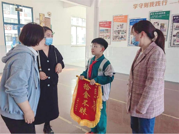 中新河南網(wǎng)4月29日電:陽(yáng)春四月,春意盎然。近日,一位來(lái)自濮陽(yáng)縣的女同志手執(zhí)一面金光閃閃的錦旗,懷著十分激動(dòng)的心情,興沖沖地來(lái)到市六中。她為啥要興沖沖來(lái)到市六中呢?一問(wèn)才知道,原來(lái)她是來(lái)市六中尋找一位拾金不昧的好學(xué)生---五年級(jí)一班的吳思辰同學(xué)。