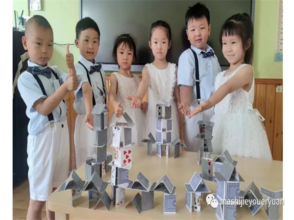 沒有嘗試,永遠不知道自己的潛能。小朋友們分工合作,孫悅軒和穆夢澤負責主要搭建,其他孩子就負責折牌,大家根據(jù)建構(gòu)區(qū)的圖片進行了模擬搭建,孩子們開動腦筋,不斷嘗試,一張張紙牌變成了城堡、高樓、鐵搭、亭子......突然,旁邊的柏辰不小心撞了一下桌子,各種建筑就塌了一半,這時,孩子們沒有互相埋怨,而是齊心協(xié)力及時補救,很快又搭好了漂亮的房子,他們感到無比的喜悅,老師也為孩子們鼓掌叫好,孩子們更加自豪。
