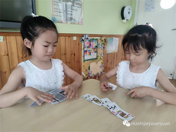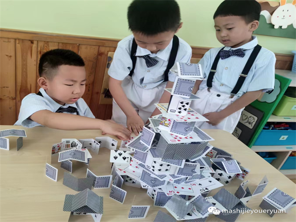 在區(qū)域活動時,老師拿出幾幅撲克牌,說要嘗試玩搭建游戲,這引起了孩子們的興趣。