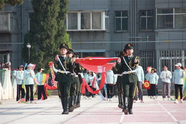 春光作序,萬物和鳴。4月27日上午8時,運動會開幕式在學(xué)校田徑場盛大開幕。校長薛軍、黨總支書記李征、副校長劉穎、劉宏、孫磊、刁勝利、工會主席何彩霞參加開幕式并在主席臺就座,全校教師和在校學(xué)生參加開幕式。開幕式由政教處主任石莉敏主持。