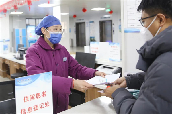 門診大廳里的白色燈光打在地板上,玻璃門上貼著的大紅色福字被燈光映照得更加耀眼。咨詢臺、收費(fèi)處零星坐著幾位病人,取藥處旁站著等待取藥的家屬。工作人員為患者提供著溫馨周到的服務(wù)。