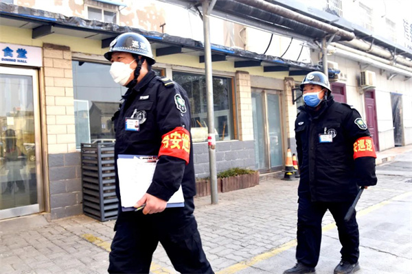門衛(wèi)值班室的保安大哥,站在北門口,指揮往來車輛的通行。在夜幕中,他們守在門口,身上裹著厚實(shí)的黑色棉大衣,搓著手,哈氣縈繞在臉龐。大衣背后的熒光條紋跳躍著,在夜幕中提醒著往來的行人,注意安全。