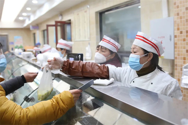 早上7點(diǎn),天還不亮,總院區(qū)西南角的餐廳已經(jīng)燈火通明。拉開門簾,進(jìn)入餐廳,暖黃的燈光打在餐廳的玻璃臺上,顯得溫情極了。臺上整整齊齊地?cái)[放著饅頭包子,旁邊的鍋里盛著熱氣騰騰的小米粥,負(fù)責(zé)餐飲的阿姨說,她早上天還沒亮就要起床到醫(yī)院餐廳,揉面洗菜煮粥,即使在除夕,也沒有休息。