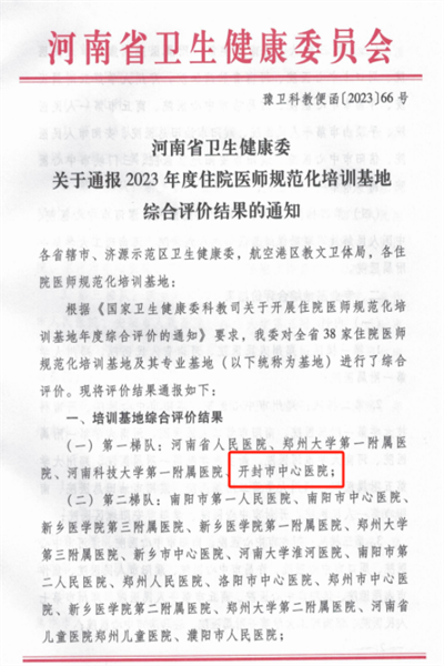 開封市中心醫(yī)院斬獲2023年度住院醫(yī)師規(guī)范化培訓(xùn)綜合評價第一梯隊(duì)