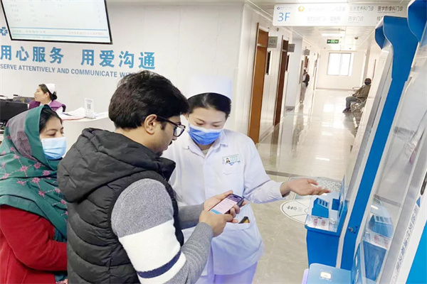 “門診一站式綜合服務(wù)中心”的工作人員岳莉,全程使用英文與巴基斯坦患者及其家屬交流,向他們耐心地講解門診業(yè)務(wù)辦理、醫(yī)保政策差異,幫助患者解決門診辦卡、掛號、繳費(fèi)等問題,為克服語言溝通的障礙,婦科門診醫(yī)護(hù)人員及導(dǎo)醫(yī)親自引領(lǐng)她前往相關(guān)科室。