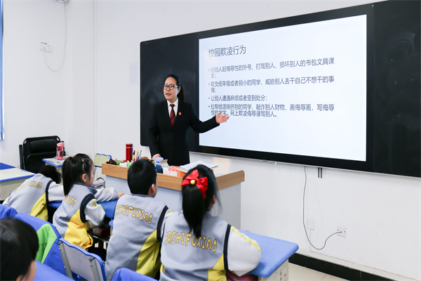 課堂上,為吸引學(xué)生們注意力,活躍課堂氣氛,王梅芳局長(zhǎng)通過(guò)PPT形式,從法官、法槌、法袍、法徽所代表的意義和作用到如何正確地用法律保護(hù)自己,用簡(jiǎn)單易懂,活潑詼諧的語(yǔ)言,通過(guò)一個(gè)個(gè)涉未成年人犯罪典型案例,向?qū)W生們講述了有關(guān)未成年人犯罪、不良行為及校園欺凌的法律知識(shí),引導(dǎo)學(xué)生們從小養(yǎng)成自覺(jué)學(xué)法、知法、守法意識(shí),提高自我保護(hù)能力,自覺(jué)抵制各種不良行為及違法犯罪的誘惑。整堂課上學(xué)生們聽(tīng)得津津有味,并積極參與互動(dòng),踴躍回答問(wèn)題,課堂氣氛活躍,取得了良好的法治教育效果。課堂結(jié)束后,王梅芳局長(zhǎng)為學(xué)生們送上了學(xué)習(xí)用品,得到了師生們的一致好評(píng)。最后,學(xué)校老師為王梅芳局長(zhǎng)頒發(fā)榮譽(yù)聘書(shū),特聘請(qǐng)王梅芳局長(zhǎng)為“家長(zhǎng)講堂”特聘講師。