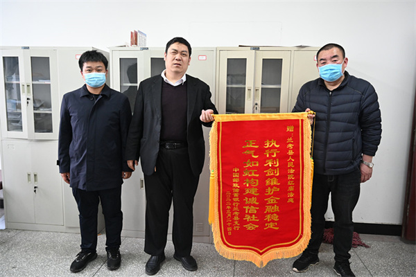 中新河南網(wǎng)3月25日電:3月25日上午,中國郵政儲蓄銀行股份有限公司蘭考支行行長冒雨來到蘭考法院給案件承辦人送一面“執(zhí)行利劍維護金融穩(wěn)定 正氣如虹構(gòu)建誠信社會”的錦旗,感謝執(zhí)行法官用20天就追回了800萬元貸款,切實維護了企業(yè)利益。