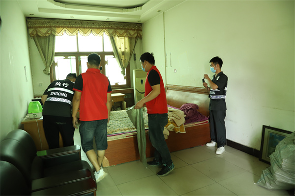 8時30分,到達現(xiàn)場后,騰房行動正式開始,現(xiàn)場四個行動小組各司其職,有條不紊地展開各自工作。警戒線一字拉開,執(zhí)行干警們迅速就位,密切配合,全程錄音錄像。