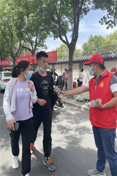 活動現(xiàn)場,黨員志愿者為考生及家長設(shè)立歇腳點(diǎn),送去了礦泉水、醫(yī)用口罩、紙巾、防暑用品等物品,并主動與考生家長溝通交流,緩解焦慮情緒,還與家長們一起為高考學(xué)子助力加油。