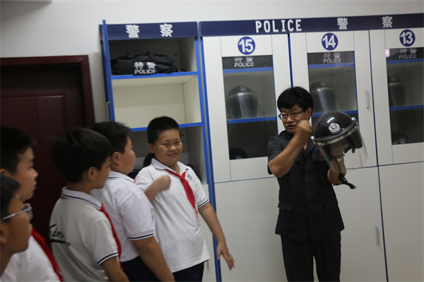 盡管夏日炎炎,同學(xué)們?nèi)詰阎鵁o比興奮和期待的心情走進(jìn)法院,在多元解紛團(tuán)隊負(fù)責(zé)人宋付振的引導(dǎo)下,同學(xué)們依次參觀了矛盾糾紛多元化解中心、審判法庭、警械室、羈押室等場所。在警械室,宋付振用通俗易懂的語言向同學(xué)們講解了司法警察使用的警棍、手銬、催淚器等警械裝備,讓學(xué)生們親身體驗(yàn),近距離感受警用裝備的材質(zhì)及用途。