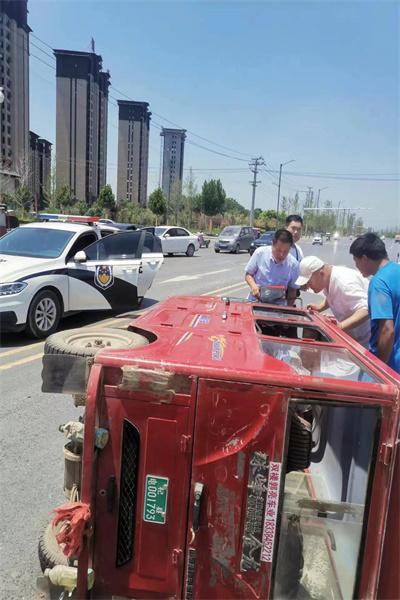 中新河南網(wǎng)7月7日電:7月7日上午,河南省開封市龍亭區(qū)人民法院執(zhí)行干警朱元強、劉國勝、王斌和齊子敬一行4人,在去杞縣執(zhí)行案件途中,朱元強突然看到前方發(fā)生一起因汽車急轉(zhuǎn)彎導(dǎo)致電動三輪車側(cè)翻的交通事故,發(fā)生路段車流較多且車速較快,極有可能造成二次事故,現(xiàn)場情況非常危急。