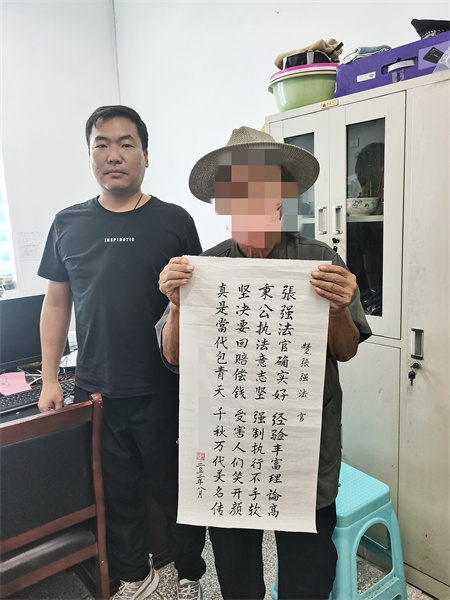 申請執(zhí)行人領(lǐng)取該筆案件款后,深受觸動的時某某爺爺手寫了一封表揚信送到執(zhí)行干警張強的辦公室,通過一句句真摯的話語,表達對執(zhí)行干警深深的謝意。