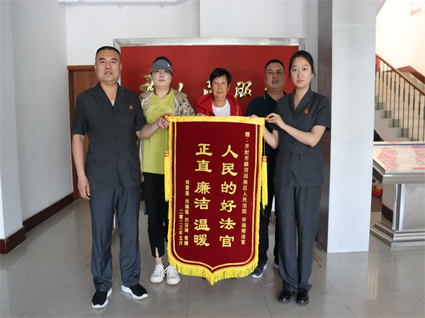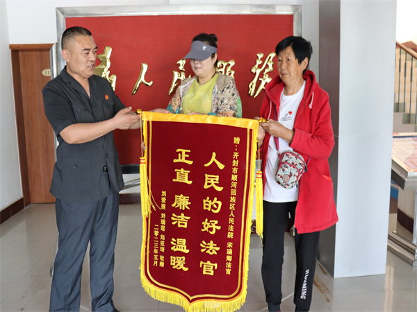 中新河南網(wǎng)5月24日電:5月23日上午,三名當(dāng)事人來(lái)到開(kāi)封市順河法院,將一面寫(xiě)有“人民的好法官 正直廉潔溫暖”的錦旗送到順河法院審判管理辦公室主任宋瑞卿的手中,以表對(duì)承辦法官公正司法、溫情調(diào)解的認(rèn)可與感激。