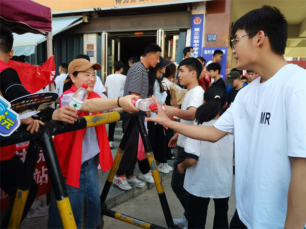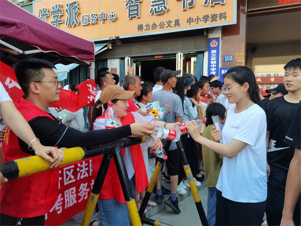 開考前,干警志愿者們早早來到學校門口,免費為廣大考生和家長提供礦泉水,為考生送上關心和鼓勵,并提供高考心理咨詢、法學專業(yè)報考指導等服務,同時與陪考家長進行溝通,幫助他們排解心理壓力、舒緩緊張情緒。炎炎夏日,高溫炙烤著大地,汗水浸濕了志愿者的衣裳,但志愿者們依舊精神飽滿,盡職盡責。