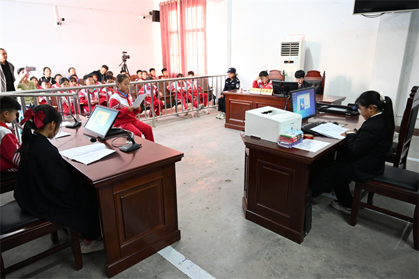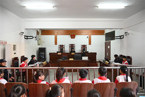 模擬法庭現(xiàn)場,開封市祥符區(qū)第二實驗小學(xué)的同學(xué)們正在“審理”一起校園人身傷害案件,干警辛翔宇對庭審流程進行指導(dǎo)完善,并對同學(xué)們的問題進行耐心解答。在法槌的一起一落間,親身體驗審判流程,這一刻,法治的種子在同學(xué)們的心中生根發(fā)芽。通過將校園中常見的問題帶入法庭進行由同學(xué)們親自“審理”,引導(dǎo)同學(xué)們在遇到摩擦和沖突時,要善于做情緒的主人,冷靜沉著地應(yīng)對突發(fā)狀況,及時向老師和家長尋求幫助。