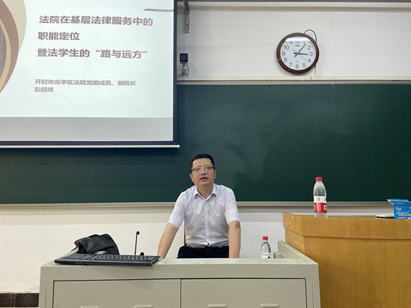 中新河南網5月25日電:5月24日下午,開封市龍亭區(qū)法院黨組成員、副院長彭超峰應邀到河南大學法學院,以“法院在基層法律服務中的職能定位暨法學生的路與遠方”為題,為百余名法學本科生授課。