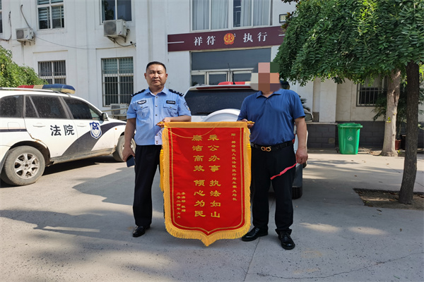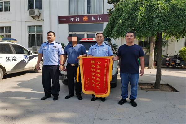 “朱局長,宗法官,我只是打了“執(zhí)行110”的值班電話,沒想到這大熱天你們頂著太陽為了案件奔走,真沒想到你們出警這么快,......實在不知道說啥好,一面錦旗表達感謝!”