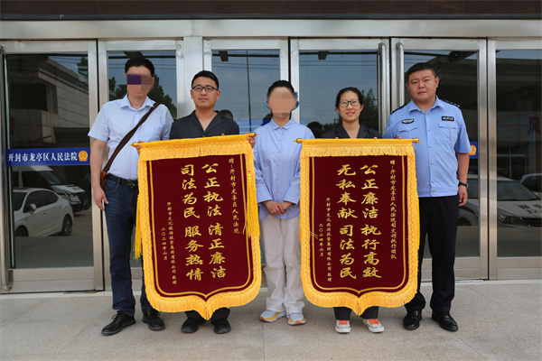 中新河南網(wǎng)6月27日電:6月26日,一起合同糾紛案件的當(dāng)事人來(lái)到開(kāi)封市龍亭區(qū)人民法院,將兩面寫(xiě)有“公正執(zhí)法 清正廉潔 司法為民 服務(wù)熱情”和“公正廉潔 執(zhí)行高效 無(wú)私奉獻(xiàn) 司法為民”字樣的錦旗送到執(zhí)行干警的手中,對(duì)他們公正、高效、盡心盡責(zé)追回4600多萬(wàn)元巨額案款表示感謝。