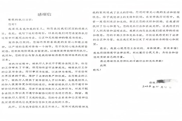 中新河南網(wǎng)11月14日電:申請人陳某霞與被執(zhí)行人開封市某房地產(chǎn)經(jīng)紀(jì)有限公司、被執(zhí)行人朱某某之間的房屋買賣合同糾紛一案,在開封市示范區(qū)法院執(zhí)行法官王子恒的不懈努力下,被執(zhí)行人履行了43萬元案款,申請人為執(zhí)行法官送上了錦旗和感謝信,以表達(dá)她對法院執(zhí)行工作的認(rèn)可和感激之情。