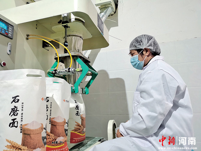 圖② 11月5日,在濟(jì)源示范區(qū)承留鎮(zhèn)張河村村集體辦的面粉廠上班的脫貧戶原雪環(huán)在加工石磨面粉。