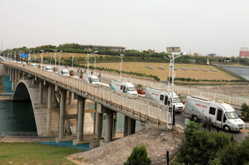 科普大篷車(chē)車(chē)隊(duì)行進(jìn)在南水北調(diào)中線工程水源地渠首大橋上