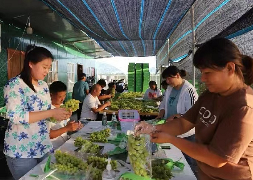 一大早,沐浴著清晨的陽光,這邊葡萄莊園負責人張紅波組織果農(nóng)們,正忙著采摘、裝袋、打碼、裝箱,現(xiàn)場一派忙碌景象;工人們正將一串串綠寶石般的“陽光玫瑰”葡萄從果園里采摘后運輸?shù)奖ur庫,在保鮮庫內(nèi),工人們又開始分揀裝箱,臉上滿是豐收的喜悅。那邊網(wǎng)紅達人手捧優(yōu)質(zhì)的陽光玫瑰,現(xiàn)場做起了網(wǎng)絡(luò)直播,受到了大批粉絲的點贊、關(guān)注,圈粉滿滿。